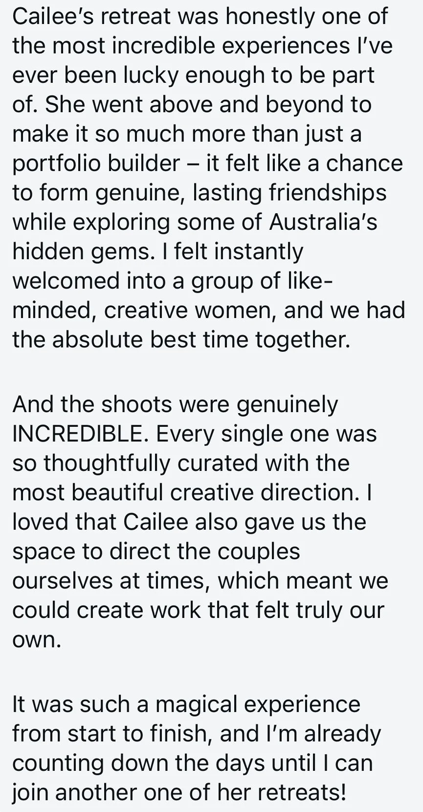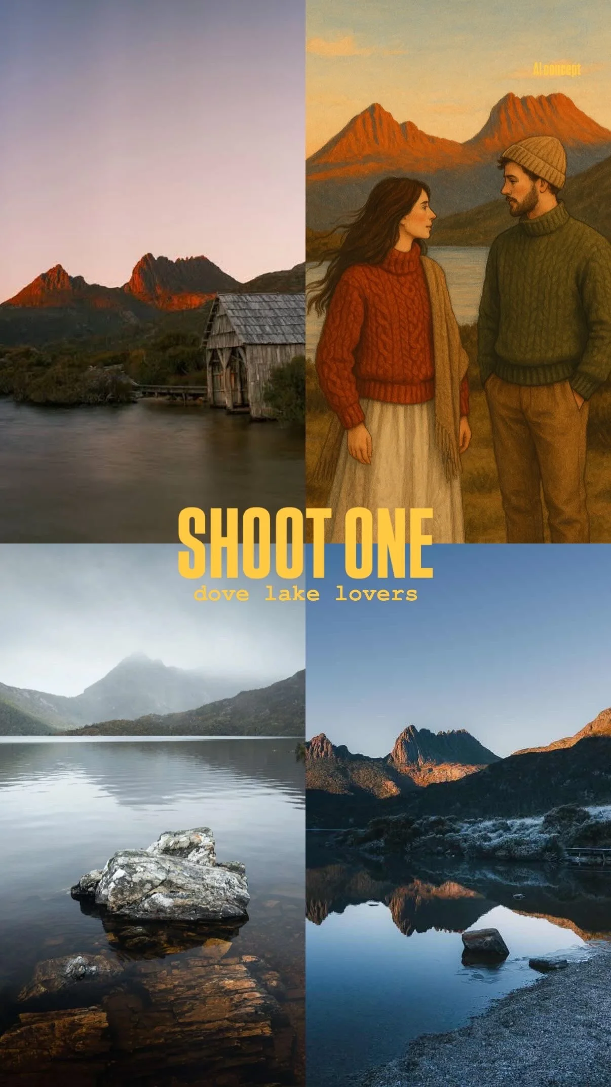 Cinematic styled shoots — including Cradle Mountain, a heritage micro wedding, and a sunrise finale.