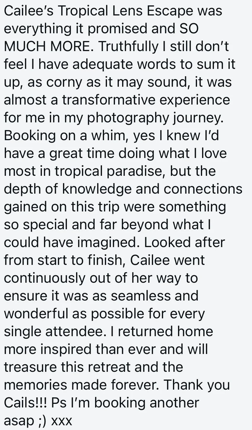 Tickets are non-refundable, but if you’re unable to attend you may transfer your ticket to another photographer with written approval from Cailee. Travel insurance is highly recommended in case of unexpected changes.